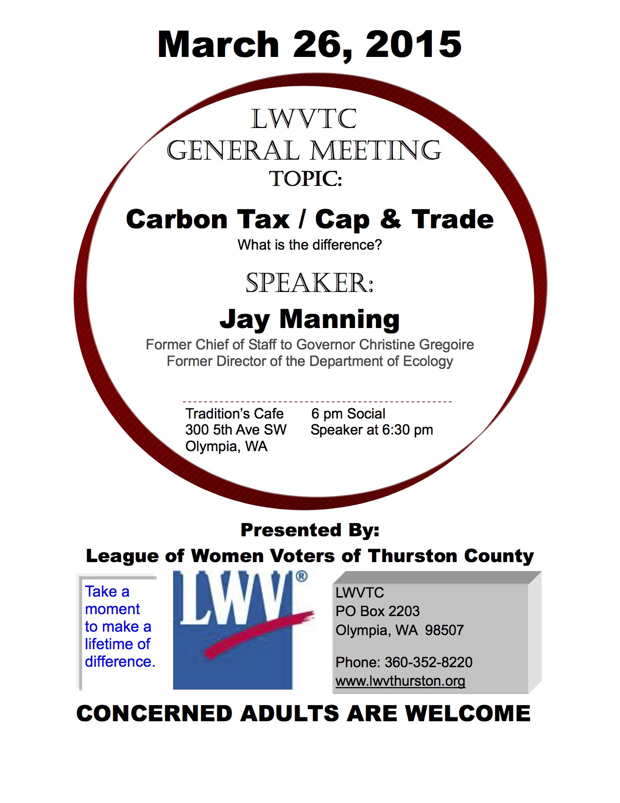 The League of Women Voters of Thurston County general meeting topic for March 2015 will be Carbon Tax / Cap & Trade. The meeting will be held on March 26, at Tradition’s Café in Olympia. There will be a 6 p.m. social with the speaker at 6:30 p.m.