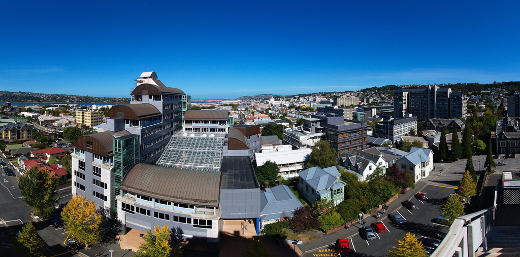 Panorama of University of Otago campus, Dunedin, New Zealand, photographed from top of University College. Building of Commerce, Psychology, Allen Hall Theatre, Richardson Building, Archway Lecture Theatre Complex.